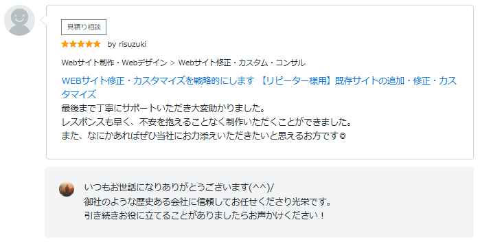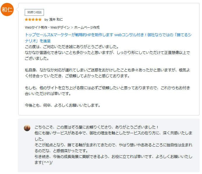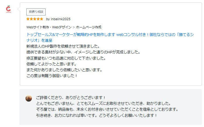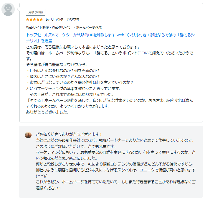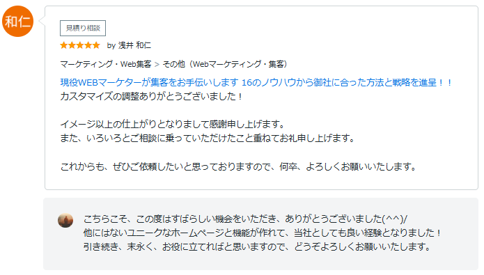 ※この記事にはプロモーションが含まれていますココナラ(coconala)で提供中のホームページ制作や関連サービスに寄せられたクライアント様の声を紹介します。下記は2025年度の実績/評価(口コミ)です。※随時、更新中! クライアント様の声 「良いな」と思ったらシェアしてください!損はさせません URLをコピーしました! URLをコピーしました!